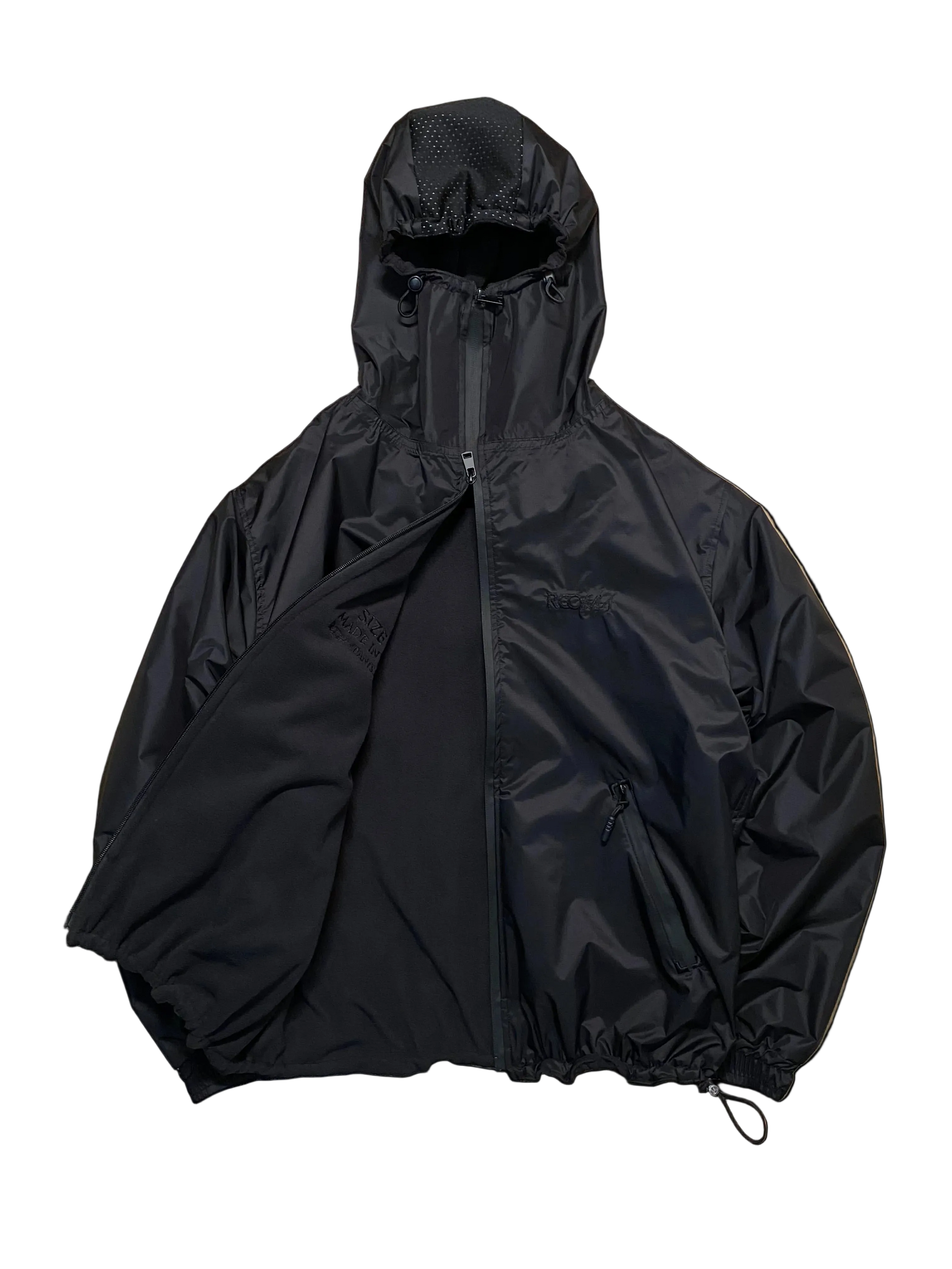 The out shell of this jacket comes in a combination of black ripstop polyester with waterproof properties and straight band starting from the hood down to the bottom with an asymmetrical effect with reflective base and mesh on top. Every stitches have been sealed with waterproof tape.