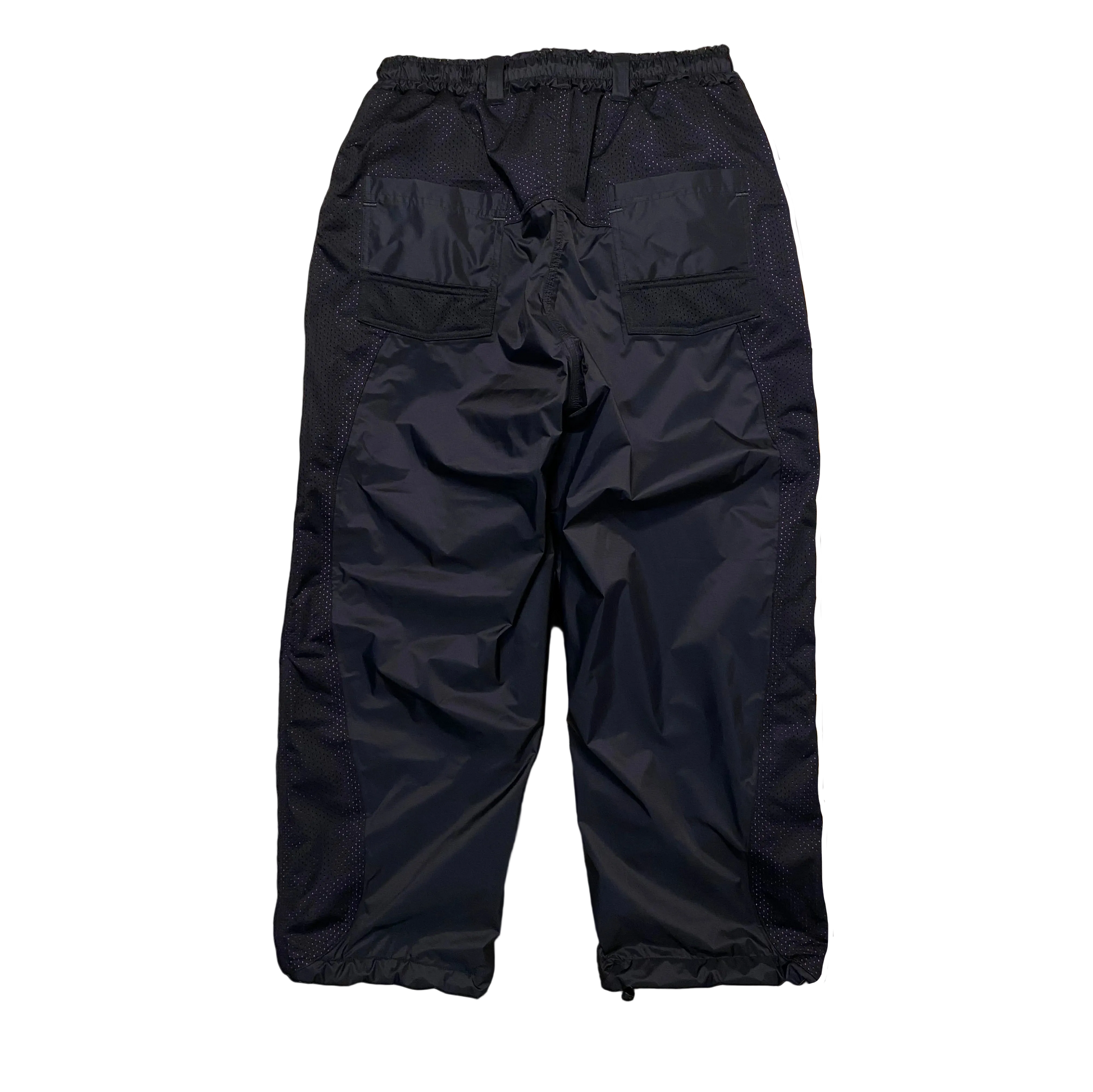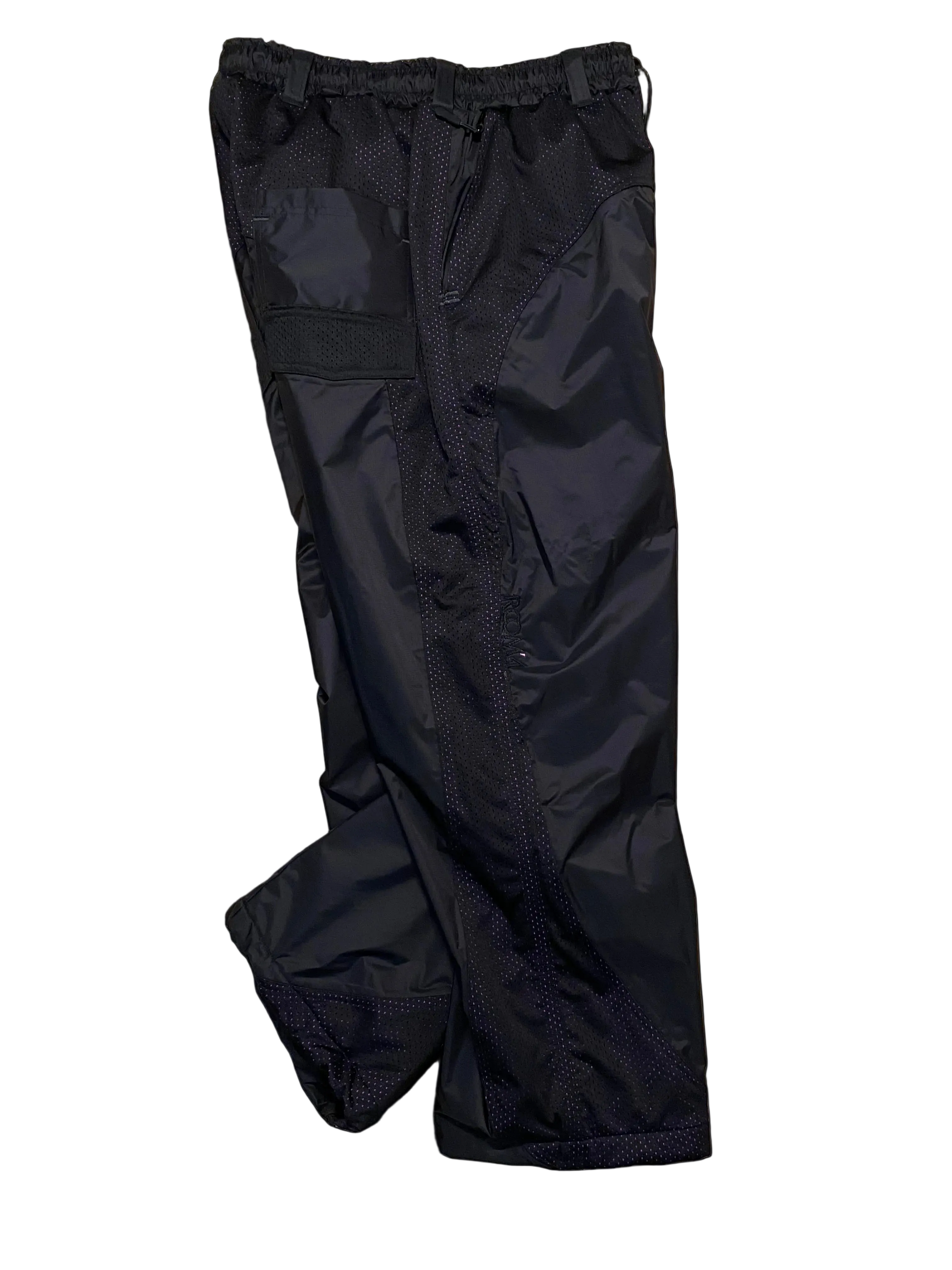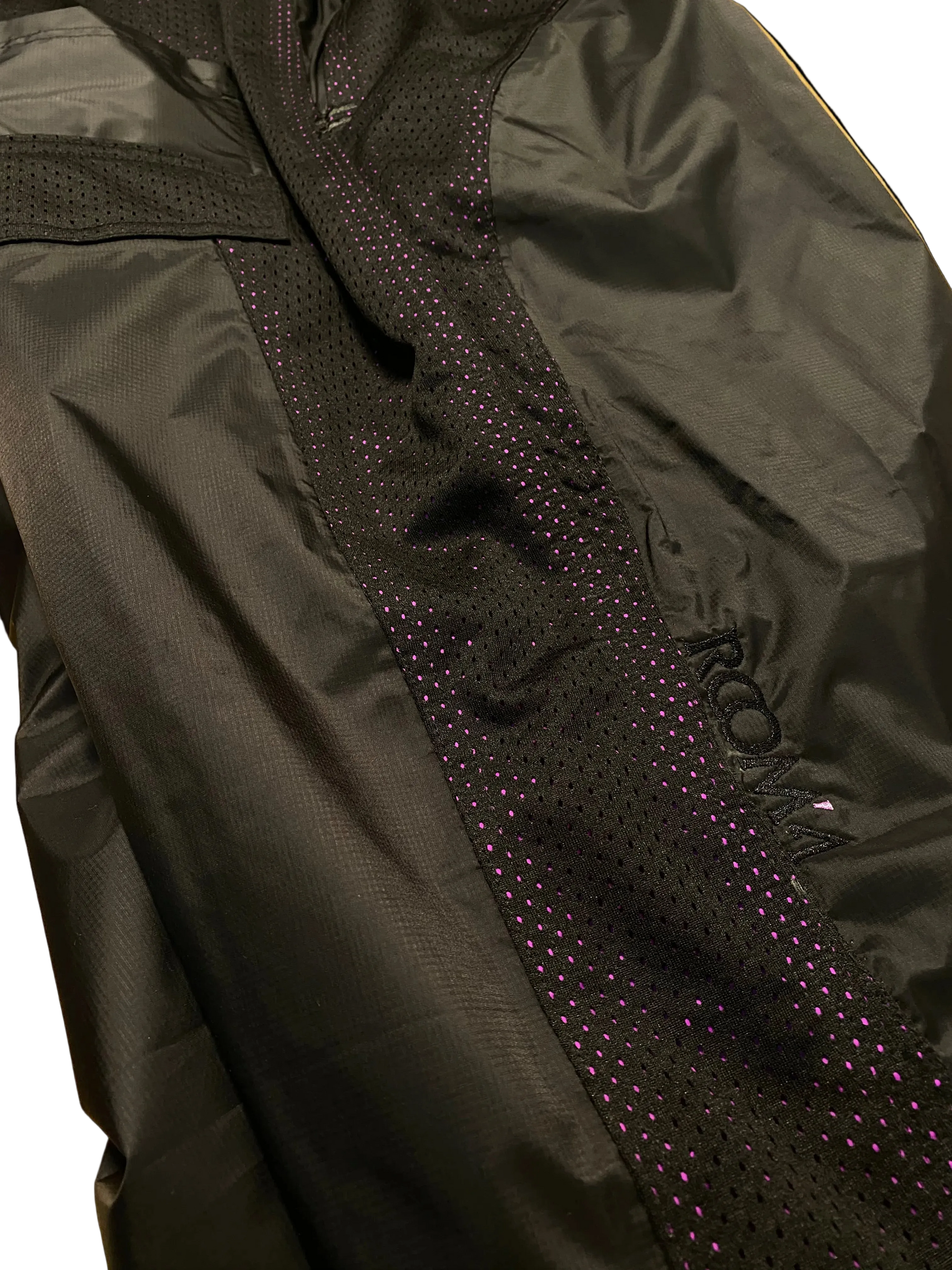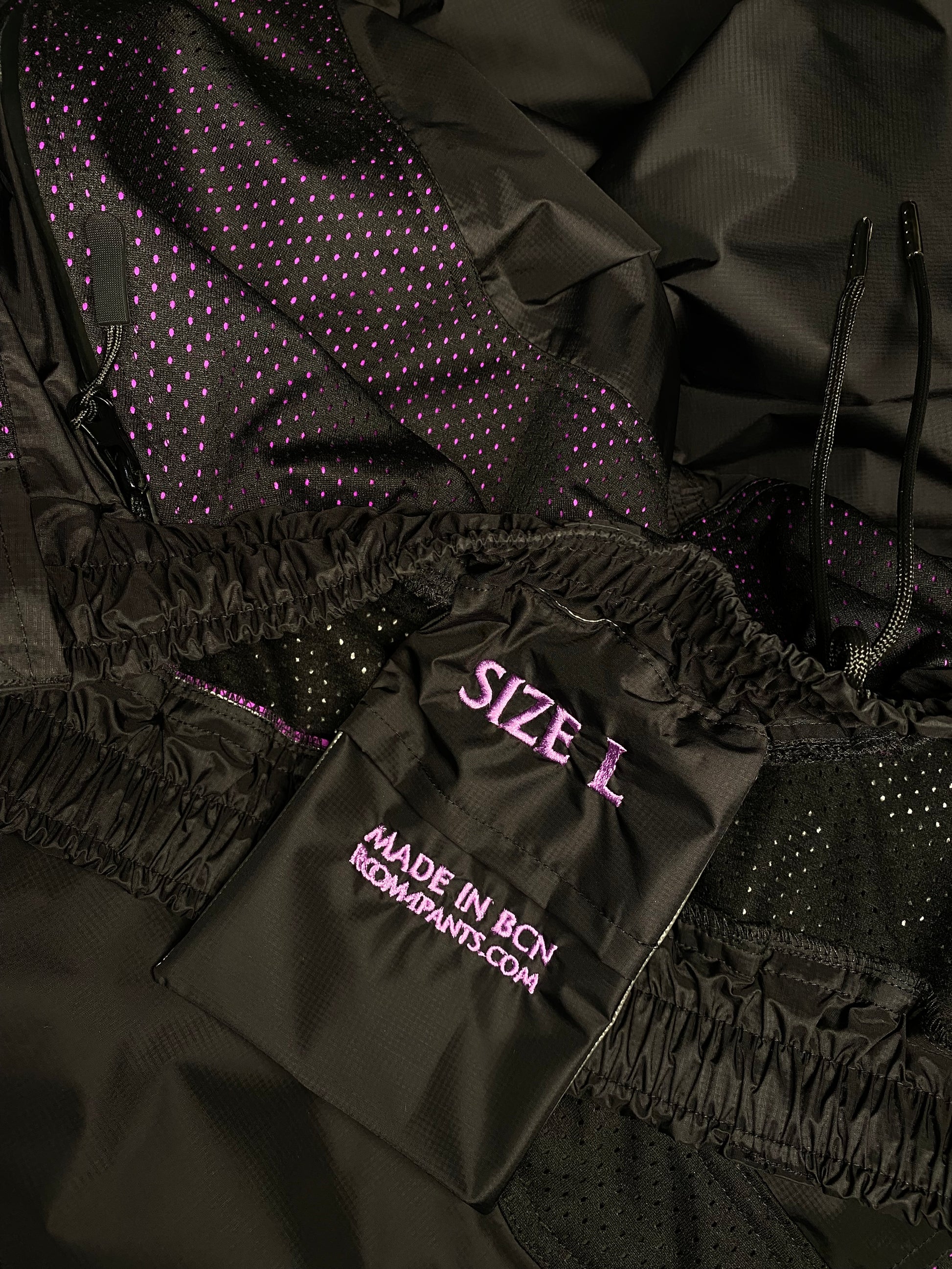 The out shell of these pants come in a combination of black ripstop polyester with waterproof properties and curvy pattern with purple base and mesh on top. Every stitches have been sealed with waterproof tape.